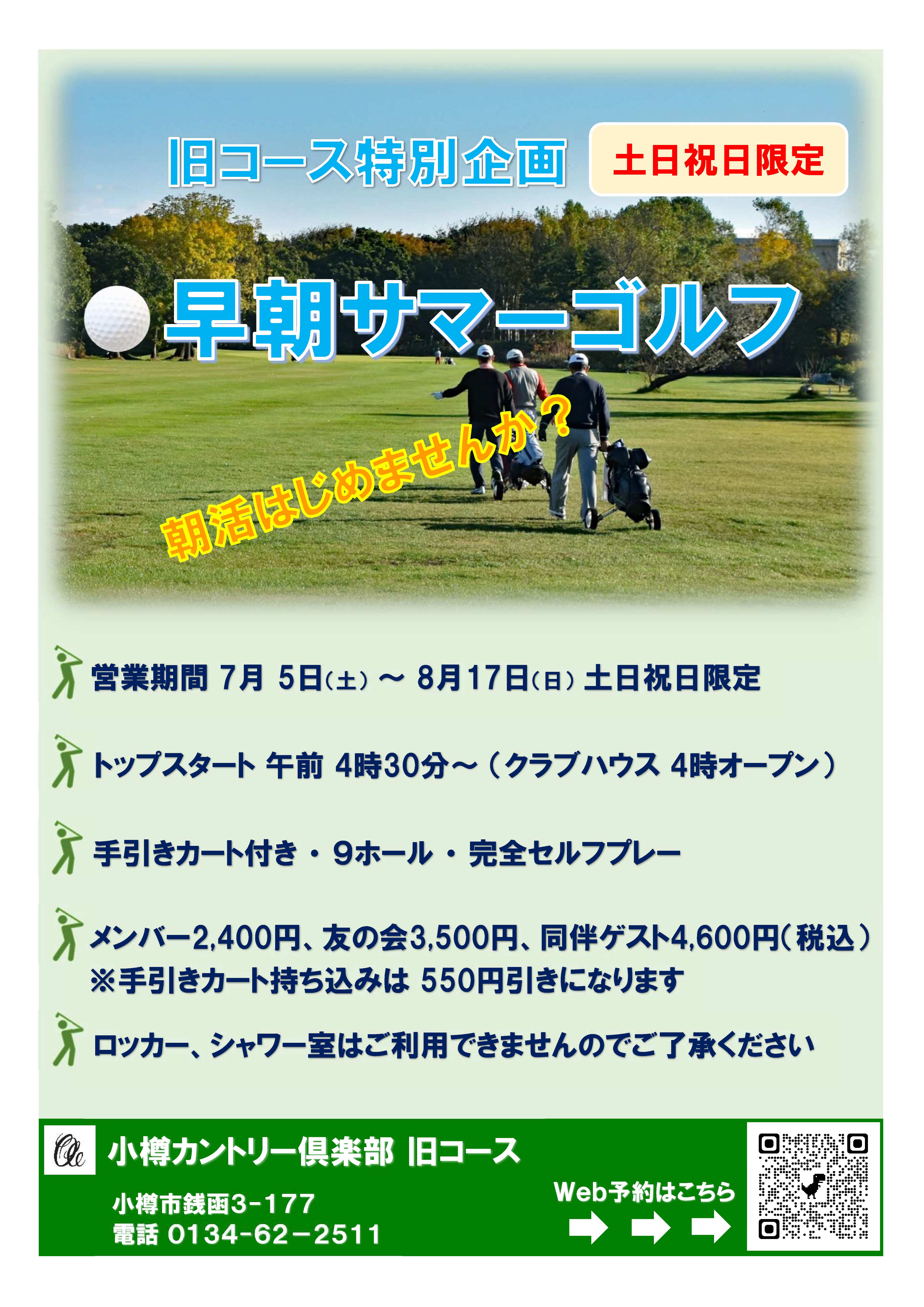 旧コースでは下記の通りサマータイム営業を開始致します。日中の熱い時間帯を避け、さわやかな早朝の時間に快適なプレーはいかがでしょうか!